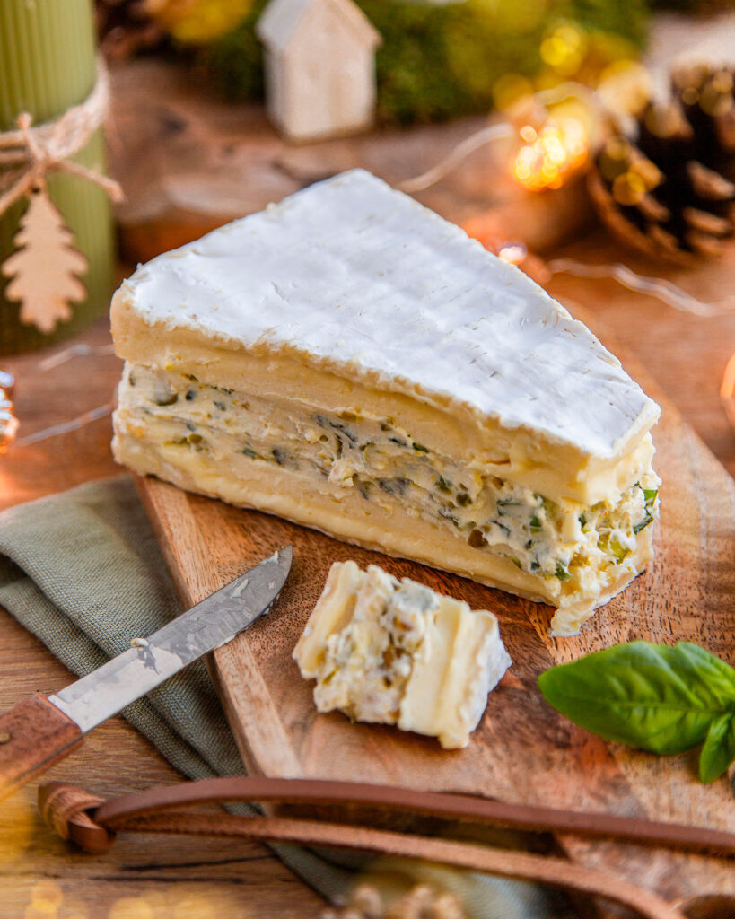Gourmand et raffiné, ce Brie de Meaux farci aux pistaches, aux amandes et au basilic frais marie la douceur crémeuse du fromage au croquant des fruits secs et à la fraîcheur aromatique des herbes, pour un apéritif ou un plateau de fromages plein d’élégance.