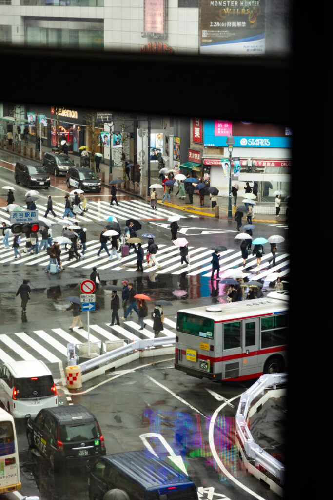 Le carrefour est entouré de gratte-ciel illuminés, de panneaux publicitaires géants et de magasins emblématiques, ce qui lui donne une atmosphère ultra-moderne et iconique du Tokyo contemporain. Beaucoup de visiteurs montent à l’étage des cafés ou des bâtiments voisins pour observer la scène de haut et prendre des photos mémorables.